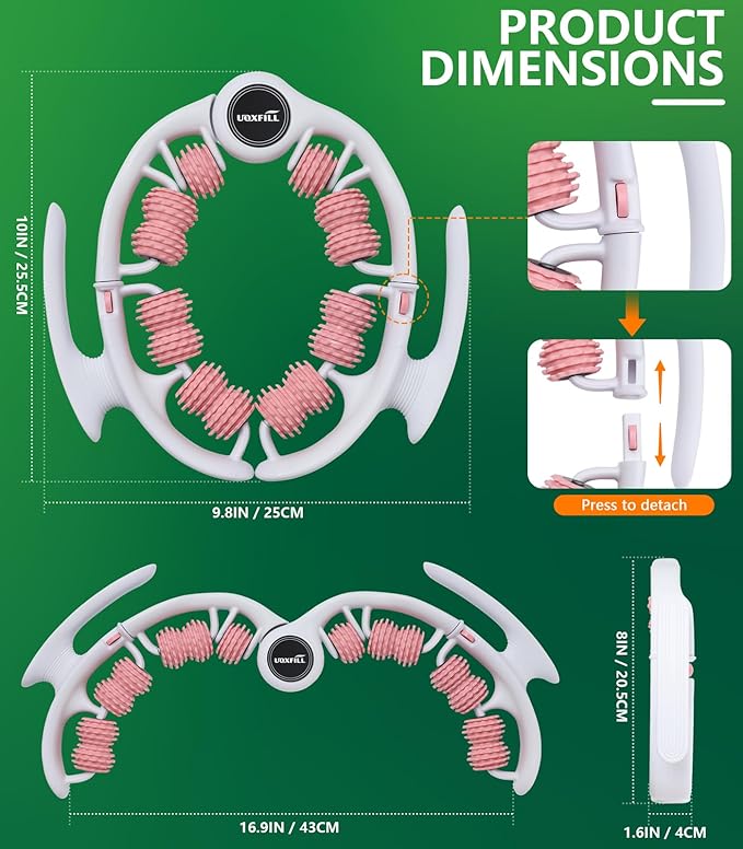 - 【Durable Split Design】 The 8 independent 360° rollers feature a ribbed teardrop design to maximize results. Surrounding the area with targeted rolling action allows for a deeper massage that destroys cellulite.Durable split design can be also separated into two small single part with rollers and handle, to massage your neck, arm, foot and other most parts of your body.