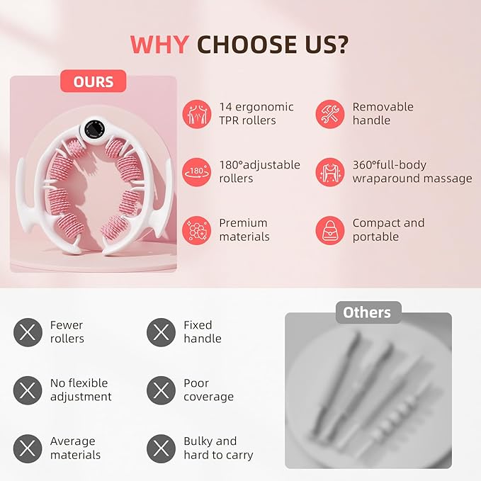 - [Deep-Tissue Massage with Multi-Roller Design]: Our circular leg clamp roller features multiple ergonomic rollers that mimic deep kneading. It effectively stimulates fat tissue, helps reduce the look of cellulite, boosts skin elasticity, and leaves your body feeling firmer and smoother