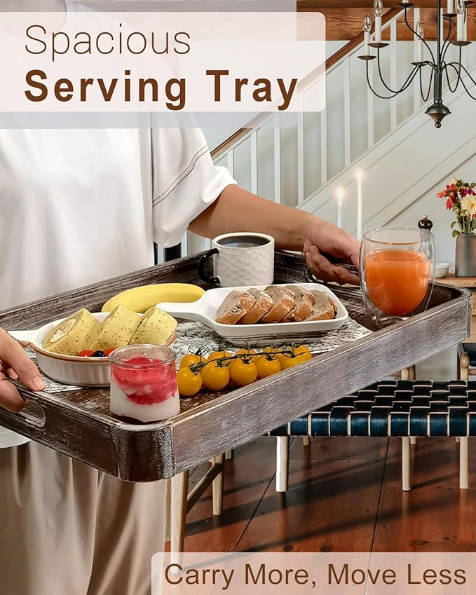 22 Inch Rustic Wood Serving Tray with Handles, Large Rectangular Wooden Ottoman Tray, Beautiful Home Décor for Living Room Coffee Table Couch, Ideal for Serving Food Breakfast BBQ Parties