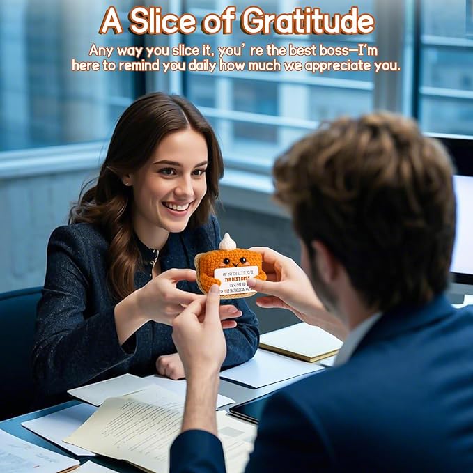 - A Sweet Gift for the Best Boss This handmade crochet pumpkin pie features a heartfelt card: “You’re the best boss—the piece that holds us together.” A clever and thoughtful way to recognize great leadership.
