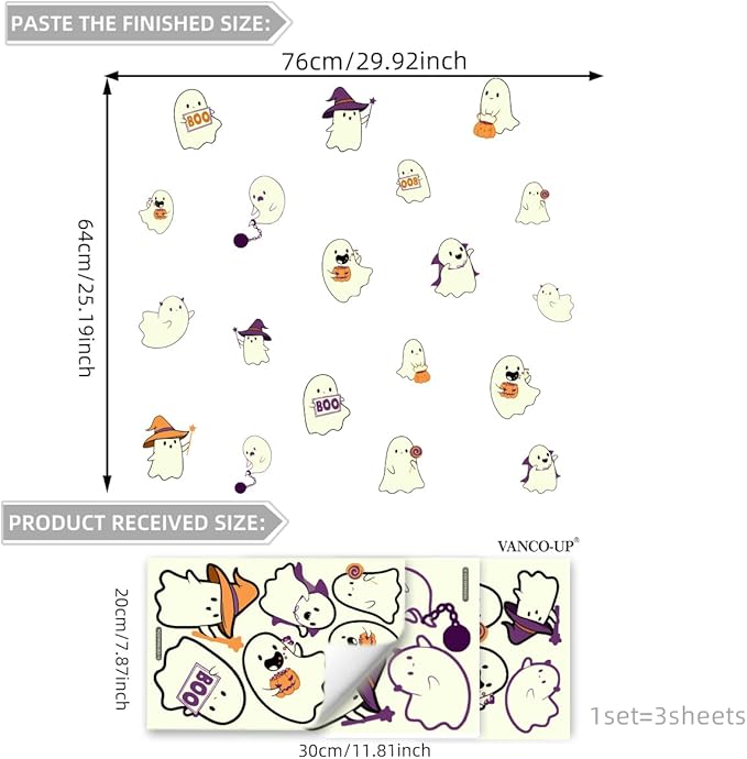- Package Content: You will receive 1 set of Halloween glow-in-the-dark window clings, measuring 7.9x11.8 inches, with different sizes and shapes of ghosts, plenty of quantity, with a variety of lovely patterns to meet your Halloween decoration needs
