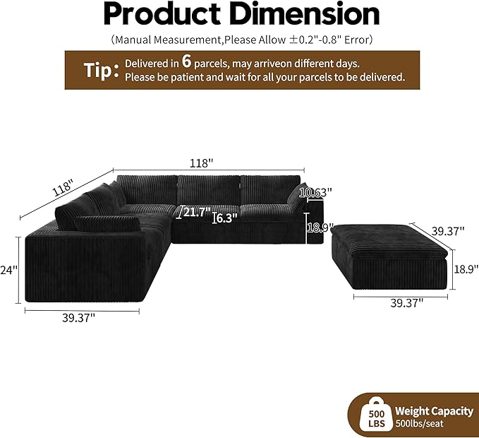 - Tips: 6 Boxes Packaging and sometimes they arrive at different times.Due to the sponge rebound, when just unpacked, the size may deviate from the picture size, after 72 hours of resting, the product size will be restored to the size of the picture If you have any questions about your cloud couch or need assistance, please reach out to us as soon as possible.