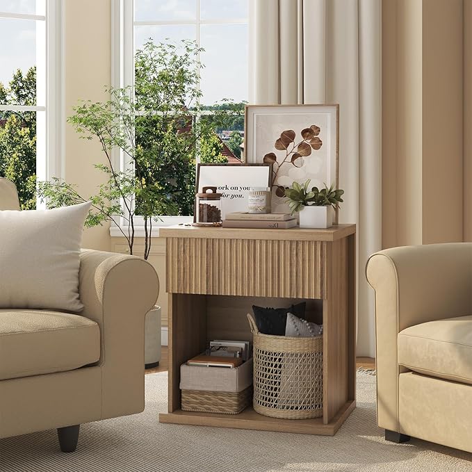- Wave-Pattern Design: elegant 3D wave detailing on drawer fronts for a sophisticated, tactile experience that effortlessly matches any bedroom aesthetic. The natural wood nightstand matte laminate resists stains and easy to wipe clean.