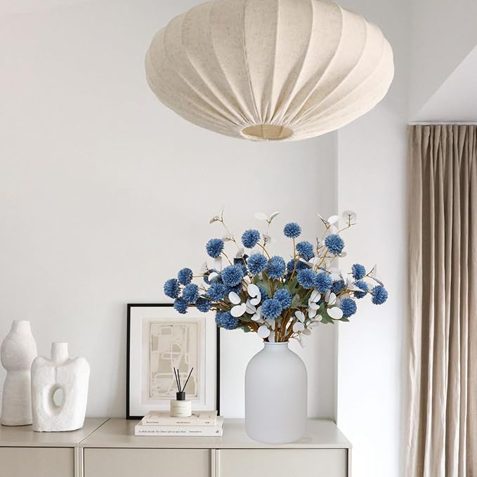- Blue Artificial Flowers - This set of faux dusty blue flowers which features 2 branches white eucalyptus stems and 10 blue fake mums artificial flowers, creates stunning blue centerpieces for tables. With long stems for vases and perfect for silk flower arrangements, it’s ideal for floral wedding decorations or blue floral decor in living rooms, dining areas, or kitchen.