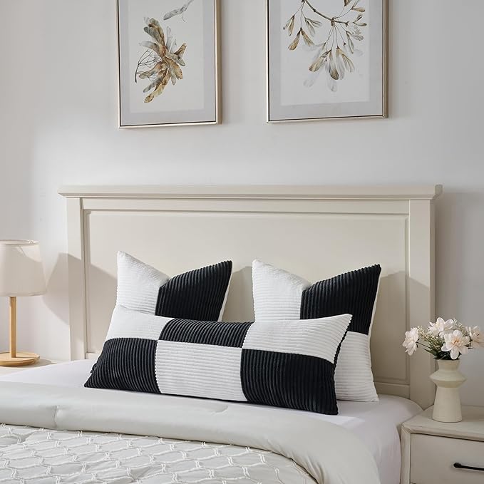 Fancy Homi Set of 2 Black White Samll Decorative Throw Pillow Covers 18x18 Inch with for Couch Bed Sofa Living Room, Soft Cross Patchwork Striped Corduroy Modern Square Cushion Case 45x45 cm