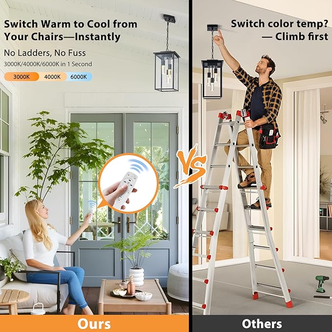 - Remote-Controlled, Dimmable Outdoor Pendant Light for Patio: No more manual tweaks on the light body—AIBISOD black outdoor pendant light for patio comes with a remote, letting you adjust color temp and brightness easily from the ground. Stepless dimming (0-100%) and one-touch half-bright mode save 50% energy, fitting gatherings or high patio/porch spots perfectly
