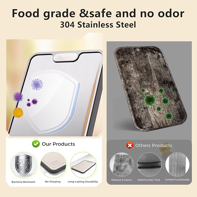- 【Easy to clean】This product is easy to clean, simply wipe the stainless steel cutting board with soap and water, or put the product in the dishwasher to easily clean, reducing your tedious work steps.