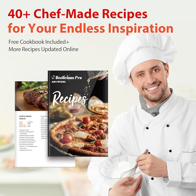 - 【Endless Options for Your Inspiration】Easily start cooking unlimited types of food through 8 modes setting, wide time & temp control range and 40+ Chef-Make Recipes Included. (Air Fry,Roast,Bake,Broil,Fries,Steak,Reheat,Dehydrate with range 1~60mins & 100℉~450 ℉). Get Limitless Meal Options with Our Smart Digital Air Fryer!