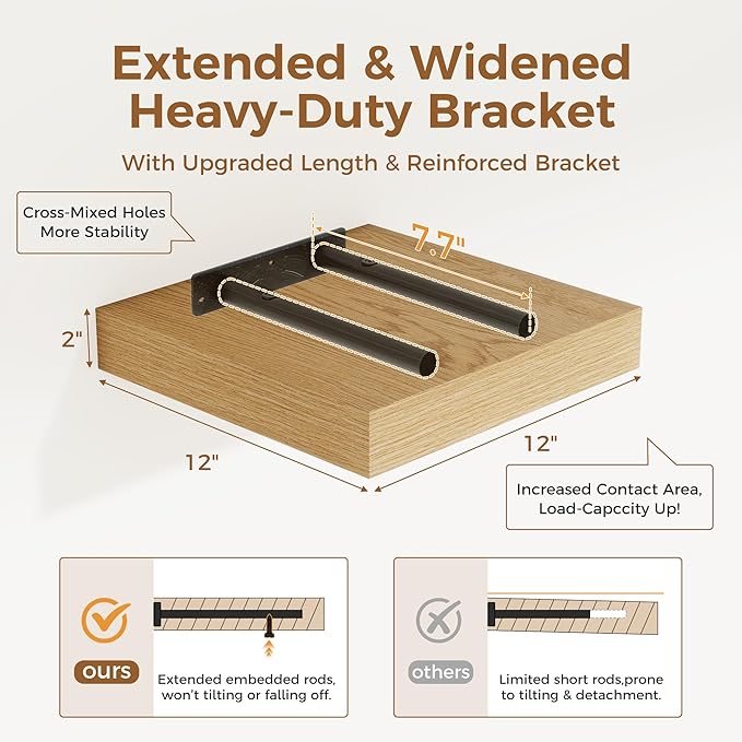 Fun Memories 12 Inch Floating Shelf, Rustic Wood Wall Shelves for Wall Decor & Storage, 12 x 12 Floating Shelf for Living Room, Bathroom, Bedroom, Oak, Set of 2