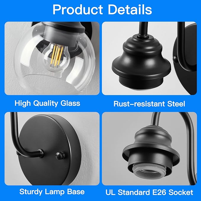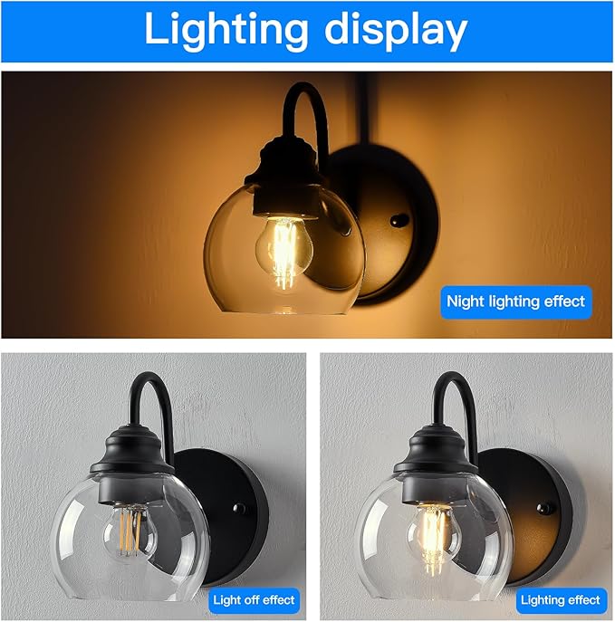 - [Excellent wall lamps]: Two sets of wall lamps are composed of transparent glass lampshades and metal bases. The transparent glass lampshades ensure good light transmittance. The gooseneck design not only restores the classic farmhouse style but also brings a touch of tenderness to your space, making it less rigid. The manufacturing process of matte black metal paint ensures that the wall lamps will not oxidize or fade.
