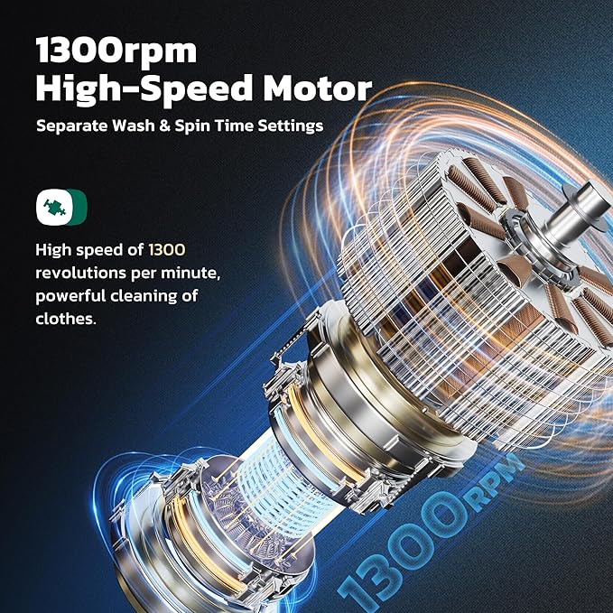 - [Powerful Performance+Sterilization Design] The portable washer machine adopts a newly upgraded copper core motor, providing a high speed of 1300RPM, 250W washing power+140W dehydration power, effectively removing stains. The silver ion penetration technology on the barrel wall deeply cleans the fibers of clothing, protecting your clothing health.