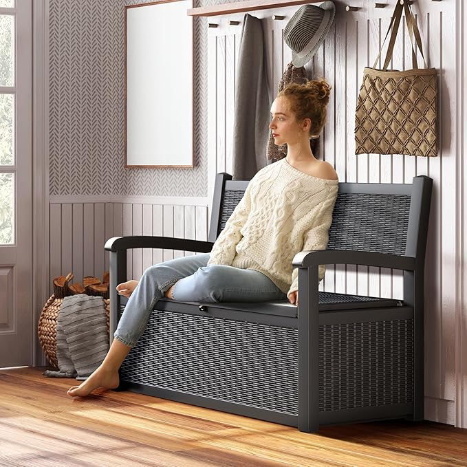 - Massive Hidden Storage: Unlock 70 gallons of extra space beneath this deck box bench, measuring 51.2 ''L x 22.4 ''W x 34.6 ''H; Organize patio cushions, gardening tools, and seasonal items effortlessly. Open lid design keeps contents dust-free and discreetly hidden.