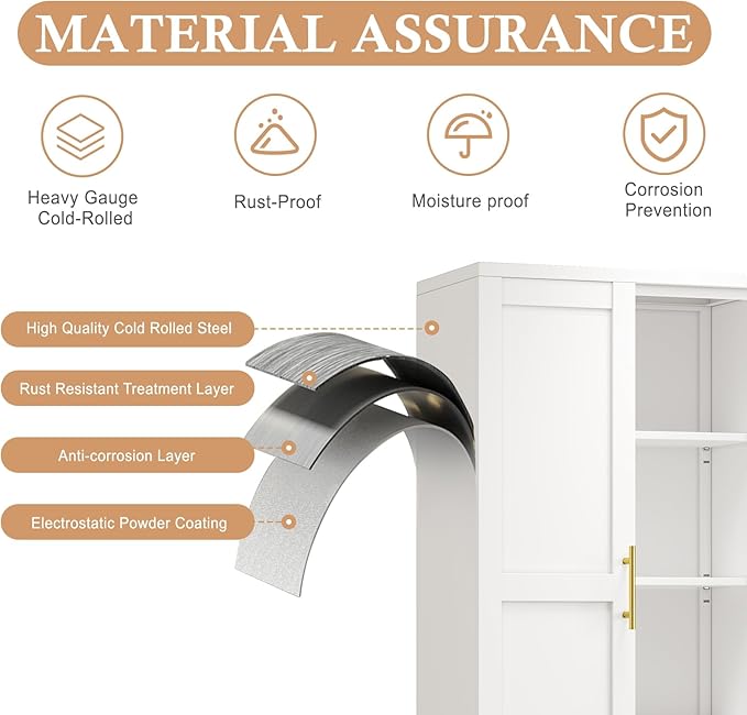 - 🌽【Sturdy Metal Structure】Our storage cabinets are generously sized to unlock the potential of your space.3 adjustable shelves can easily accommodate your storage needs. Our Metal Kitchen Pantry Storage Cabinets are made of durable cold-rolled steel material, with a safe and environmentally friendly powder coating on the surface, which is rust-proof, anti-corrosion, and odorless, ensuring safe food storage. Not only does the metal construction provide a large load capacity of up to 120 pounds, but it also makes it scratch resistant.